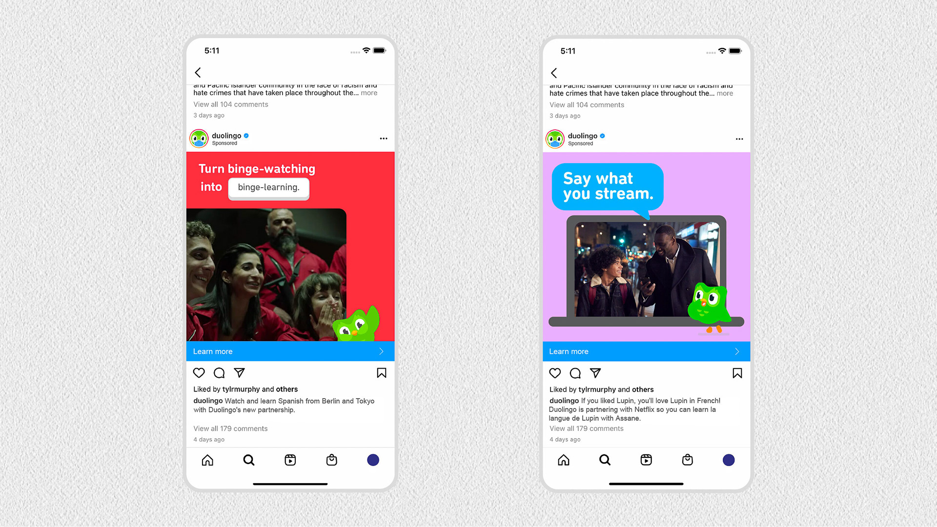 From their music interests to their top-streamed shows, it’s clear Gen Z is interested in more international content than ever. But how can we get them to learn a language rather than just listen to it? With TalkShows, Duolingo is partnering with Netflix to create lessons based on fan-favourite foreign language shows, turning binge-watching into binge-learning.*